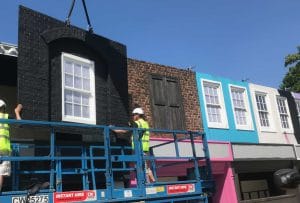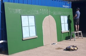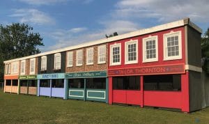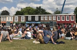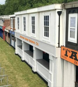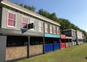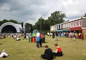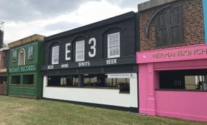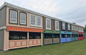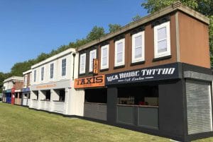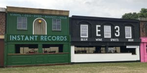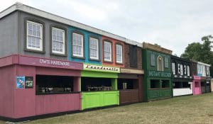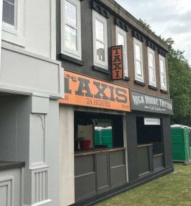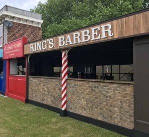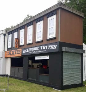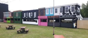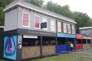 A collection of East London shop style bar buildings at the All Points East Festival in London’s Victoria Park, designed, built and installed by Spacial Installations. Several of these structures are based on shipping containers with modular layout for easy re-use and re-cladding. All feature a full custom finish with individual signage and built-in serving bar infrastructure.
