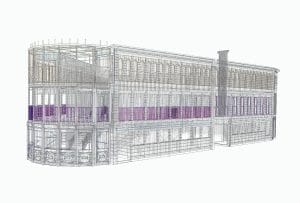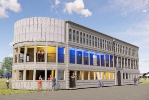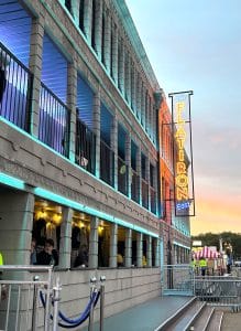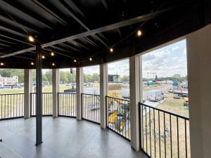 Features include a VIP viewing platform area, with internal staircase access. Interactive experience areas with access to a marquee bar in the atrium of the structure, and merchandise retail facilities around the front half of the ground floor. The whole building was coated with a weathered stone finish and had LED floodlighting and custom neon signage applied on site.