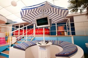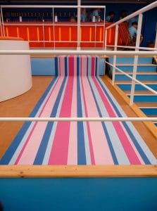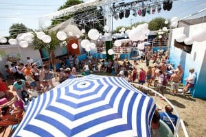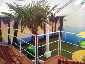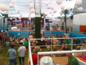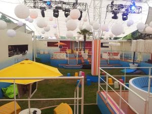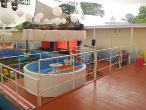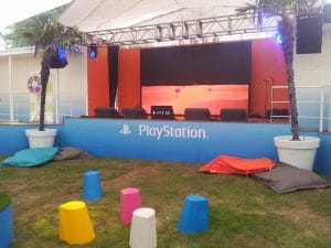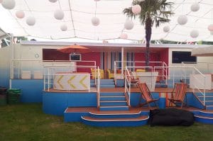 Sony Singstar Cocktails and Dreams pop-up arena. Built from two articulated lorry trailers with a bespoke centre structure and retracting roof. Also features a built in bar, DJ booth and stage, plus raised seating areas and re-skinnable exterior wall. The set appeared at Glastonbury, Camp Bestival and Bestival over a number of seasons.