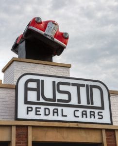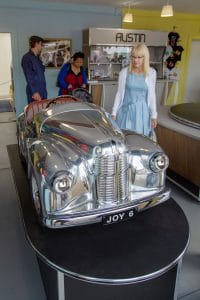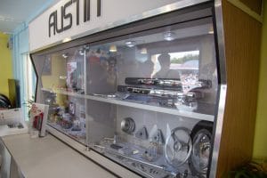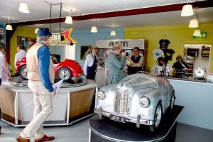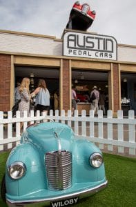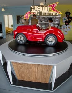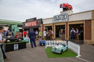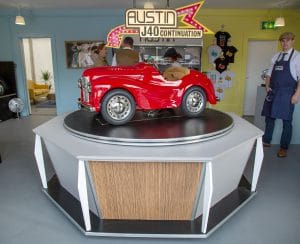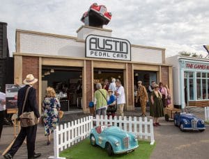 We were asked to overhaul and update the SU Carburetters high street shop at Goodwood Revival into the new Austin Pedal Cars showroom. Following on from our earlier work creating a set of interiors and display cabinets the previous year, we were asked to build additional units and refurbish the internal space of the shop. In addition we created a large 3D logo sign above the entrance and an illuminated sign over the display plinth.