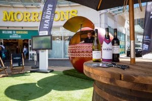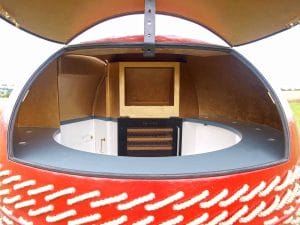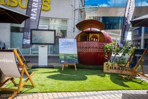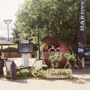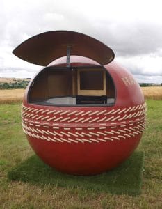 Giant cricket ball wine bar transported to various events by trailer. Features a hinged front serving hatch, rear access door, custom paint finish with logo and artificial grass platform.
