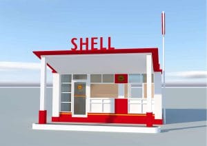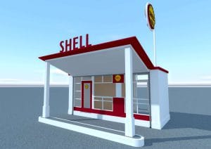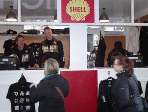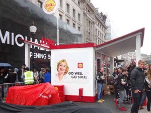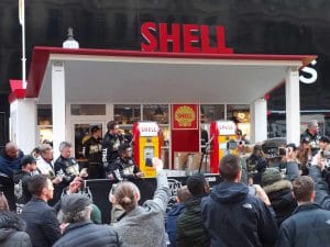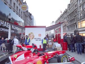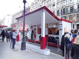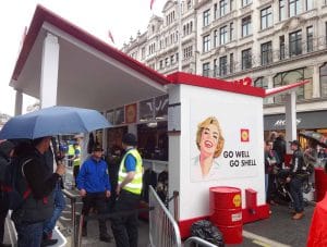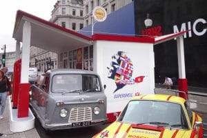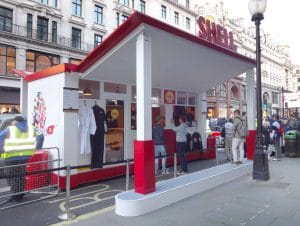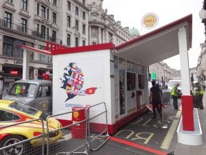 Retail unit and Gumball Rally finish line presence for Shell. This structure was built from a 20′ shipping container, with a hinged roof canopy designed to fold flat to the sides for transit. Located on Regents Street in central London, this structure had to be installed, operated and then removed within a 24 hour period. The final structure was finished with hand painted enamel, and featured custom enamel signs and logos.