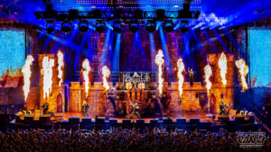 With a tight tour schedule of twenty live shows in twenty-eight days across Europe, rapid installation and de-rig was paramount. This was achieved through a custom metalwork system and heavy-duty flight cases engineered specifically for both road and air transport. The front and side sections of the castle ramparts include integrated lighting and flame FX, all used to maximum effect throughout each show.