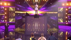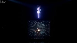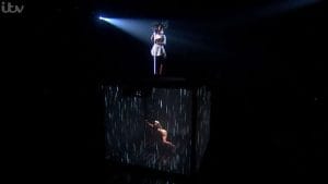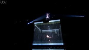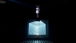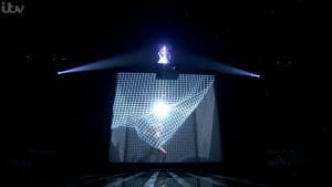 Steel frame cube with projector brackets built for Sia’s live X-Factor performance of ‘Alive’. The stage has voile covered sides which pick up the projection, and also allow the dancer inside to be seen. Spacial designed and built the frame, liaising with the production and projection teams in a very short timescale, and placed it on and off the stage during the live show. Watch the whole performance here: https://www.dailymotion.com/video/x3h4vn6